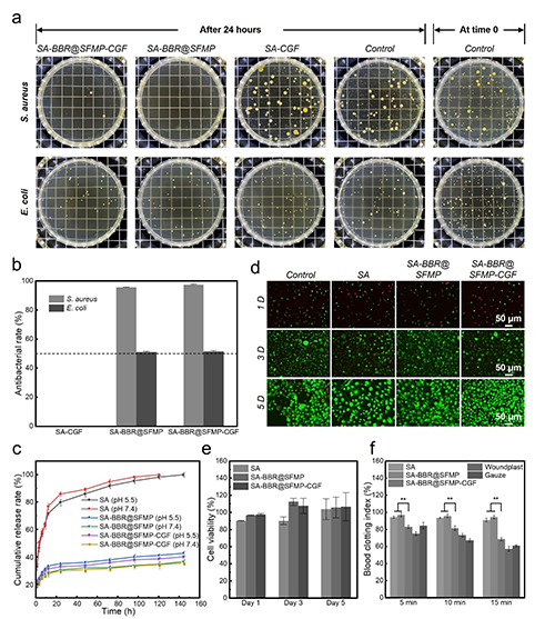 圖3. SA-BBR@SFMP-CGF復(fù)合水凝膠的抗菌活性、藥物釋放及生物相容性:(a) SA-CGF, SA-BBR@SFMP, SA-BBR@SFMP-CGF對金黃色葡萄球菌和大腸桿菌的抗菌表征;(b) 抗菌性能(50%-90%為抑菌,>90%為強效抑菌);(c) SA, SA-BBR@SFMP, SA-BBR@SFMP-CGF在兩種PBS緩沖液中的藥物釋放曲線;(d) 不同復(fù)合水凝膠敷料浸提液培養(yǎng)小鼠成纖維細胞的熒光染色結(jié)果;(e) CCK-8法檢測復(fù)合水凝膠敷料細胞增殖結(jié)果統(tǒng)計圖;(f) 凝血指數(shù)統(tǒng)計圖。