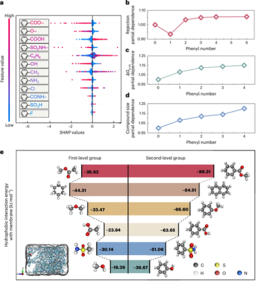 進(jìn)一步探索苯基與其他基團(tuán)結(jié)合后的情況發(fā)現(xiàn),當(dāng)極性和非極性官能團(tuán)與苯環(huán)相連接時(shí),表現(xiàn)出特殊的多基團(tuán)耦合效應(yīng)。例如,比如羧基(–COOH)和羥基(–OH),單獨(dú)看都是典型的親水基團(tuán),理論上能幫助污染物被膜截留。但一旦它們與苯基相連,親水優(yōu)勢(shì)會(huì)被徹底削弱——苯基的疏水特性會(huì)“拉著”它們,反而加劇污染物與膜的疏水相互作用,讓去除變得更難。分子動(dòng)力學(xué)模擬結(jié)果證實(shí)示,“多基團(tuán)耦合效應(yīng)”主要通過(guò)改變分子–膜之間的疏水相互作用能量實(shí)現(xiàn)的(圖3e)。更復(fù)雜的是苯基數(shù)量的影響:當(dāng)膜處理的 OMPs 中苯基數(shù)量增加時(shí),去除率會(huì)先下降、后上升。這是因?yàn)槎啾交鶗?huì)產(chǎn)生兩種相反的作用:一方面,更多苯基會(huì)增強(qiáng)與膜的π-π堆積效應(yīng),降低截留率;另一方面,多苯基會(huì)讓污染物分子體積變大、空間位阻增加(圖3b–3d)。因此,膜對(duì)微污染物的截留效果受到多種作用的協(xié)同控制。這些發(fā)現(xiàn)的核心價(jià)值在于:對(duì)于膜設(shè)計(jì),不能再“孤立看待某個(gè)官能團(tuán)”,而要像“搭積木”一樣,綜合考慮多基團(tuán)的相互作用。
