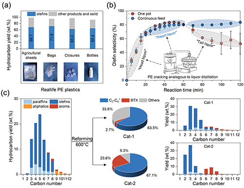 研究團(tuán)隊進(jìn)一步考察了該自限域裂解工藝的實際應(yīng)用潛力。針對農(nóng)業(yè)地膜、包裝袋等多種來源的廢棄聚乙烯,該技術(shù)均表現(xiàn)出較高的烯烴收率。由于自限域效應(yīng)有效抑制副反應(yīng),該工藝特別適用于工業(yè)化連續(xù)進(jìn)料工況,可長期穩(wěn)定維持高烯烴選擇性。此外,將自限域裂解與催化重整工藝集成,可實現(xiàn)產(chǎn)物分布的靈活調(diào)控,定向生成C?–C?輕烯烴和BTX芳烴,展現(xiàn)出良好的技術(shù)適應(yīng)性與集成能力。