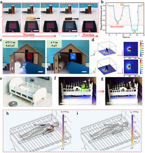 此外,通過在嬰兒床下方安裝特斯拉線圈來構建室內(nèi)家庭場景,以模擬電動嬰兒床可能產(chǎn)生的電磁輻射暴露情況。當線圈激活時,放置在嬰兒床表面的白熾燈泡會亮起。當將復合材料用作嬰兒床面板上的屏蔽層時,后續(xù)線圈的激發(fā)無法觸發(fā)白熾燈泡的亮起,這表明該復合材料在輻射防護方面具有極好的潛力,非常適合用于可穿戴電子設備和智能家居系統(tǒng)等新興應用中。