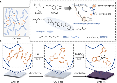 該工作通過將硅基保護的兒茶酚配位單元接枝至含硫基的聚硅氧烷鏈上,構(gòu)建了大分子交聯(lián)劑,進而通過巰基-丙烯酸酯邁克爾加成反應(yīng)構(gòu)建液晶彈性體網(wǎng)絡(luò)。隨后通過酸處理去除保護基,暴露兒茶酚單元,并與鐵離子等金屬離子配位,形成動態(tài)配位鍵,制備一系列目標動態(tài)液晶彈性體。
