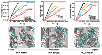 近日,大連理工大學(xué)翁志煥教授團(tuán)隊(duì)通過向聚乙烯醇網(wǎng)絡(luò)中引入具有扭曲非共面結(jié)構(gòu)的磺化雜萘聯(lián)苯聚芳醚砜酮,成功開發(fā)出兼具高透明度、優(yōu)異界面穩(wěn)定性與長效防霧性能的智能涂層。研究表明,扭曲分子結(jié)構(gòu)的引入顯著增強(qiáng)了聚合物網(wǎng)絡(luò)的自由體積與氫鍵作用,形成了獨(dú)特的雙模式孔道結(jié)構(gòu),其中小尺寸孔道(2.00 ?)有效捕獲水分子,大尺寸孔道(4.48 ?)促進(jìn)水分子快速傳輸,實(shí)現(xiàn)了"高效吸濕-快速擴(kuò)散"的協(xié)同效應(yīng)。團(tuán)隊(duì)進(jìn)一步利用SPPESK自身的光熱特性與銫鎢青銅納米顆粒的協(xié)同作用,使涂層在保持92%可見光透射率的同時(shí),具備優(yōu)異的光熱響應(yīng)性能。在1太陽光強(qiáng)照射下,涂層表面溫度3分鐘內(nèi)可升高28.5℃,有效抑制水汽冷凝并加速除霧。該涂層在40%-60%濕度環(huán)境下防霧效果可持續(xù)近60天,經(jīng)過30次冷熱循環(huán)和紫外老化測試后仍保持90%以上透光率,在眼鏡、汽車玻璃等實(shí)際場景中表現(xiàn)出顯著優(yōu)于商用產(chǎn)品的性能。這項(xiàng)研究為解決光學(xué)界面在動(dòng)態(tài)環(huán)境下的長效防霧難題提供了創(chuàng)新解決方案,在汽車視窗、農(nóng)業(yè)溫室等領(lǐng)域具有重要應(yīng)用前景。