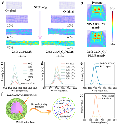 在外層受拉發(fā)光材料中加入Al?O?納米顆粒,不僅提升了應(yīng)力傳遞效率,還通過顆粒間碰撞增強發(fā)光,使發(fā)光強度較傳統(tǒng)ZnS/PDMS纖維提升5倍;