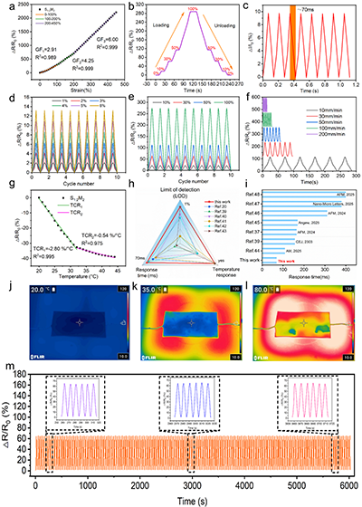 S1:2M2在0-450%應(yīng)變范圍內(nèi)呈現(xiàn)三個(gè)線性響應(yīng)區(qū)間,應(yīng)變系數(shù)(GF)分別為2.91、4.25和6.00,擬合優(yōu)度接近1,展現(xiàn)出精準(zhǔn)的應(yīng)變檢測(cè)能力。在循環(huán)階梯拉伸及不同速率(10-200 mm/min)與大、小應(yīng)變范圍(1-6%至10-100%)測(cè)試中,其電阻響應(yīng)快速穩(wěn)定、重復(fù)性高,作為腕部可穿戴傳感器時(shí)響應(yīng)時(shí)間僅70 ms,適用于實(shí)時(shí)生物應(yīng)變監(jiān)測(cè)。溫度傳感方面,在低溫區(qū)(0-31℃)與高溫區(qū)(31-45℃)的電阻溫度系數(shù)(TCR)分別為-2.80%/℃和-0.54%/℃,適用于生理溫度監(jiān)測(cè)。紅外熱成像直觀證實(shí)其熱敏感性,且在20%應(yīng)變下經(jīng)500次循環(huán)后信號(hào)仍保持穩(wěn)定,耐久性優(yōu)異。綜合來(lái)看,S1:2M2在檢測(cè)限、響應(yīng)速度及溫度響應(yīng)方面均優(yōu)于多數(shù)同類系統(tǒng)。