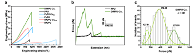 圖3 DiMPUs的增韌機(jī)制。(a)單一配位體系(PyPU和BPyPU)以及DiMPU的工程應(yīng)力-應(yīng)變曲線(xiàn);(b)DiMPU-Cu1和PPU進(jìn)行單分子力譜分析得到典型力-伸長(zhǎng)曲線(xiàn);(c)DiMPU-Cu1的斷裂力直方圖。
