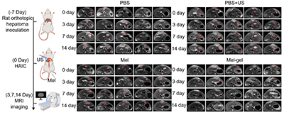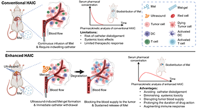 圖1:超聲驅(qū)動 Mel-gel 原位形成并增強肝動脈灌注化療的示意圖