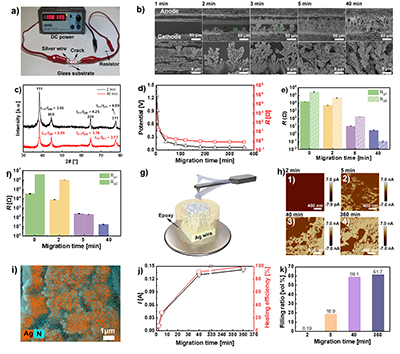 圖4. 銀線路導電自修復性能。修復條件:裂紋寬度 = 100 μm,KNO3濃度 = 1.6 wt%,銀線路與凝膠電解質接觸面積 = 0.035 mm2。(a) 模擬銀電路修復示意圖。(b) 銀遷移產物在不同遷移時間下的形貌(下排圖像是上排圖像中綠色圈出區(qū)域的放大圖)。(c) 不同遷移時間下銀遷移產物的XRD譜圖。(d) 不同遷移時間下裂紋間的電阻和電壓。(e, f)銀遷移過程中,與(e)陽極、(f)陰極連接的銀線路與膠體電解質之間的電化學反應極化電阻。(g) AFM的測試示意圖和(h) 不同遷移時間下Ag遷移產物沿生長方向橫截面的AFM電流分布圖。(i) 遷移時間為360 min時Ag和N元素在銀遷移產物截面上的分布情況。(j) 電流和自修復效率與遷移時間的關系。(k) 不同遷移時間下遷移產物中銀枝晶的體積填充率。