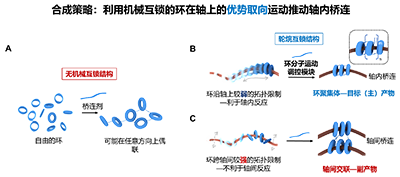 基于對分子運動實現(xiàn)獨立調(diào)控的需求,針對上述反應(yīng)選擇性難題,研究者提出利用聚輪烷機(jī)械互鎖結(jié)構(gòu)中,大環(huán)在沿軸方向與跨軸方向擴(kuò)散行為存在差異這一特點(圖1),即拓?fù)湎拗菩?yīng),從而誘導(dǎo)大環(huán)優(yōu)先在同一軸上發(fā)生橋連反應(yīng),獲得具有一定縱向拓展結(jié)構(gòu)的環(huán)聚集體。