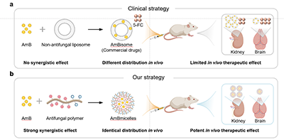 隨著真菌耐藥性日益增強(qiáng),經(jīng)典單一藥物治療方案療效往往不足甚至失敗。具有協(xié)同效果的兩種藥物組合具有比單一藥物更高療效,尤其在耐藥性和難治性感染治療中表現(xiàn)出強(qiáng)大的潛力。盡管如此,真菌系統(tǒng)性感染,尤其是真菌腦膜炎,臨床上依然顯示高死亡率。主要是由于抗真菌藥物協(xié)同組合本身非常有限,更重要的是,兩種藥物不同的藥代動(dòng)力學(xué)和體內(nèi)分布導(dǎo)致難以在體內(nèi)感染部位實(shí)現(xiàn)體外的協(xié)同效果。因此急需實(shí)現(xiàn)體內(nèi)協(xié)同治療耐藥真菌感染的有效策略。