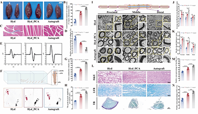 術(shù)后12周功能與形態(tài)評(píng)估顯示,Hyd_PCA組大鼠腓腸肌濕重比顯著高于Hyd組,肌纖維結(jié)構(gòu)完整、膠原沉積少;神經(jīng)傳導(dǎo)速度、復(fù)合肌動(dòng)作電位振幅及坐骨神經(jīng)功能指數(shù)(SFI)均優(yōu)于Hyd組,且接近自體移植組。組織學(xué)與TEM分析證實(shí),Hyd_PCA組再生軸突直徑、髓鞘厚度及有髓軸突密度顯著高于Hyd組,雪旺細(xì)胞分布均勻,神經(jīng)結(jié)構(gòu)規(guī)整,且炎癥與瘢痕組織少,全面驗(yàn)證了PCA復(fù)合導(dǎo)管在神經(jīng)形態(tài)修復(fù)與功能恢復(fù)中的顯著成效(圖8)。