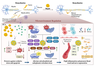 總結(jié):周圍神經(jīng)損傷后瓦勒氏變性引發(fā)缺血、炎癥及氧化應(yīng)激微環(huán)境,損傷部位Fe2+蓄積通過芬頓反應(yīng)加劇ROS生成,誘發(fā)細(xì)胞凋亡、內(nèi)質(zhì)網(wǎng)與線粒體應(yīng)激,阻礙神經(jīng)再生;而PCA可通過雙重作用協(xié)同調(diào)控該微環(huán)境:一方面螯合過量Fe2+并直接清除自由基,減少ROS介導(dǎo)的氧化損傷;另一方面緩解細(xì)胞器應(yīng)激、促進(jìn)ATP生成、抑制TNF-α等炎癥因子表達(dá)、上調(diào)VEGF/CD31等血管生成相關(guān)因子,同時(shí)調(diào)控凋亡相關(guān)蛋白平衡,最終協(xié)同促進(jìn)血管重建與神經(jīng)再生(圖9)。