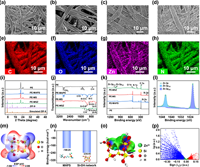 SEM、XRD、FTIR、XPS結(jié)果分析都表明了SiO2與ZIF-8涂層在PE纖維表面的均勻原位沉積。進一步通過密度泛函理論計算得到Si-OH網(wǎng)絡(luò)與Zn2+之間具有更高的結(jié)合能;诜肿用芏Hirshfeld劃分的獨立梯度模型(IGMH)對優(yōu)化后的Si-OH網(wǎng)絡(luò)與Zn2+之間的相互作用進行可視化分析表明,它們之間存在強吸引作用(配位作用、離子-偶極作用)和范德華力作用。綜上所述,PE-MS通過Si-OH與Zn2+之間存在的共價鍵作用(Si-O-Zn鍵)和強吸引作用,使得ZIF-8涂層沿著纖維表面原位生長。