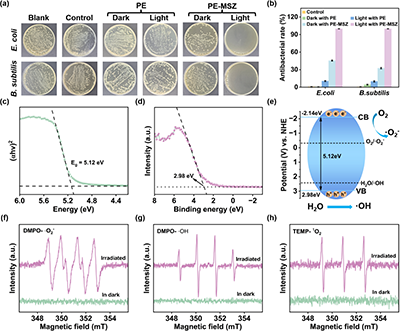 文章研究了PE-MSZ非織造布對大腸桿菌和枯草芽孢桿菌的光催化抗菌活性,經(jīng)過120分鐘模擬太陽光照射后,PE-MSZ非織造布完全抑制了大腸桿菌與枯草芽孢桿菌的生長,實現(xiàn)99.9%的抗菌率。