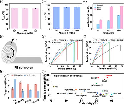 在實際測試條件下,PE-MSZ非織造布覆蓋下的皮膚溫度較棉布降低了2.8°C,顯示出顯著的個體熱調(diào)控效果。此外,在與商業(yè)化汽車遮陽膜、屋頂隔熱膜以及聚乙烯基產(chǎn)品Tyvek材料的對比研究中,PE-MSZ非織造布表現(xiàn)出更為優(yōu)越的輻射制冷性能。值得注意的是,即便經(jīng)過500次磨損循環(huán)和5次洗滌循環(huán)處理,該改性非織造布仍能保持穩(wěn)定的光學性能和高效的抗菌活性,充分證明了其優(yōu)異的機械耐久性與功能穩(wěn)定性;谄鋬(yōu)異的光學響應(yīng)、良好的機械強度以及持久的光催化抗菌性能,PE-MSZ非織造布在建筑集成熱管理、個人熱舒適調(diào)控及生物安全防護等領(lǐng)域展現(xiàn)出廣闊的應(yīng)用前景。