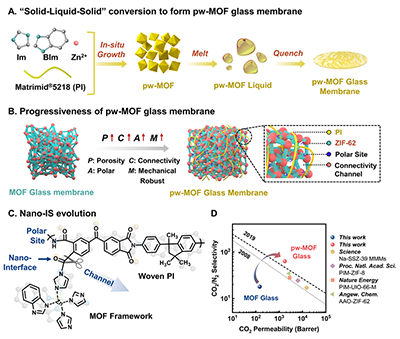 可液態(tài)加工的金屬有機框架(MOF)玻璃重新定義了節(jié)能碳捕集膜的理想材料。然而,MOF玻璃膜仍存在孔隙連通性差、孔隙率不足和耐壓性差的問題,阻礙了膜技術在煙氣脫碳、天然氣純化等方面的可持續(xù)應用。