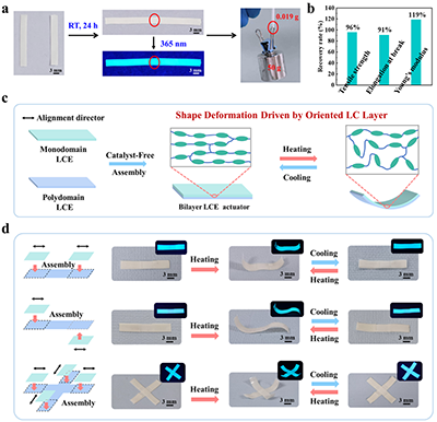 圖4 (a)兩條LCE-IB帶在室溫下經(jīng)過24小時(shí)后成功組裝成一個(gè)整體;紫外光下可直觀識(shí)別潛在損傷;組裝后的樣品可提起50g重物(為其自身重量的2600余倍);(b)LCE-IB薄膜經(jīng)無(wú)催化劑重新組裝后的力學(xué)性能恢復(fù)率;(c)雙層LCE-IB驅(qū)動(dòng)器的結(jié)構(gòu)設(shè)計(jì)示意圖及熱致彎曲形變機(jī)制;(d)LCE-IB薄膜組裝方式示意圖(左)及所制備的多種構(gòu)型驅(qū)動(dòng)器在可見光與紫外光下的實(shí)物照片(右)