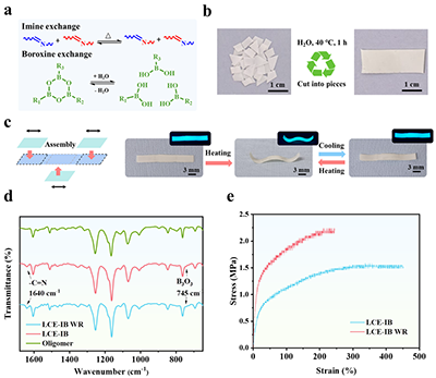 圖5 (a)網(wǎng)絡(luò)中亞胺鍵與硼氧烷鍵的動(dòng)態(tài)交換機(jī)制示意圖;(b)回收過程展示:碎片原料(左)經(jīng)40°C重物壓1小時(shí)后重構(gòu)成完整薄膜(右);(c)基于再加工LCE-IB薄膜制備驅(qū)動(dòng)器的流程示意圖(左)及驅(qū)動(dòng)器在可見光與紫外光下的工作狀態(tài)照片(右);(d)原始LCE-IB薄膜與再加工樣品的紅外光譜對(duì)比;(e)原始與再加工LCE-IB薄膜的應(yīng)力–應(yīng)變曲線對(duì)比。